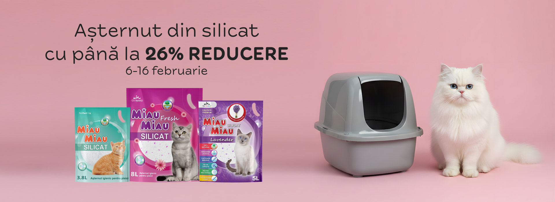 Pachet Economic MIAU MIAU Pure Bentonită, Așternut Igienic pentru Pisică, Lavandă, 4x5kg – bentonită premium neagră antibacteriană cu parfum de lavandă, formează bulgări instant, captează mirosurile, nu produce praf. Ideal pentru igiena pisicilor adulte.