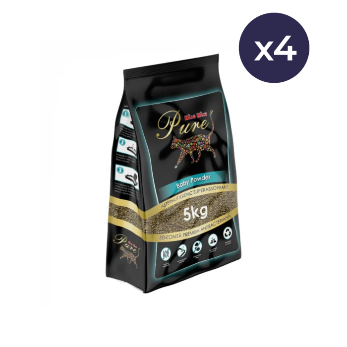 Pachet Economic MIAU MIAU Pure Bentonită, Așternut Igienic pentru Pisică, Baby Powder, 4x5kg – bentonită premium antibacteriană cu parfum delicat de pudră pentru bebeluși, formează bulgări instant, captează mirosurile, nu produce praf. Ideal pentru igiena zilnică a pisicii.
