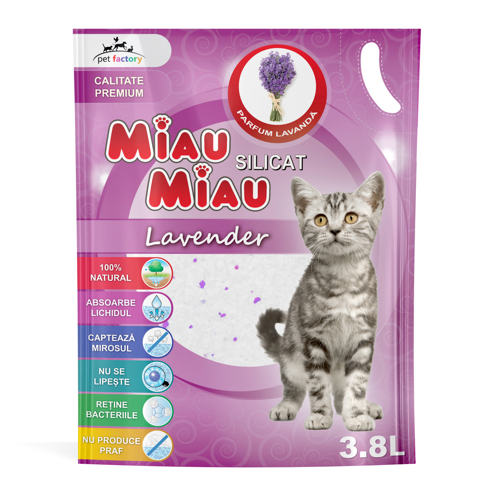 MIAU MIAU Silicat Lavanda 3.8L este un așternut igienic pentru pisici din silicat natural, cu parfum de lavanda.