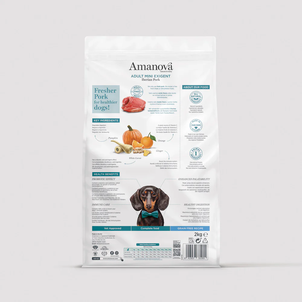 Hrană Uscată Câine Adult, AMANOVA Exigent, Talie Mică, Porc, 7kg este o hrană super-premium completă, fără cereale, special formulată pentru câinii adulți de talie mică cu apetit crescut sau preferințe alimentare selective. Rețeta utilizează carne de porc iberică proaspătă ca unică sursă de proteină animală, fiind ideală pentru câinii sensibili sau predispuși la alergii și intoleranțe alimentare.