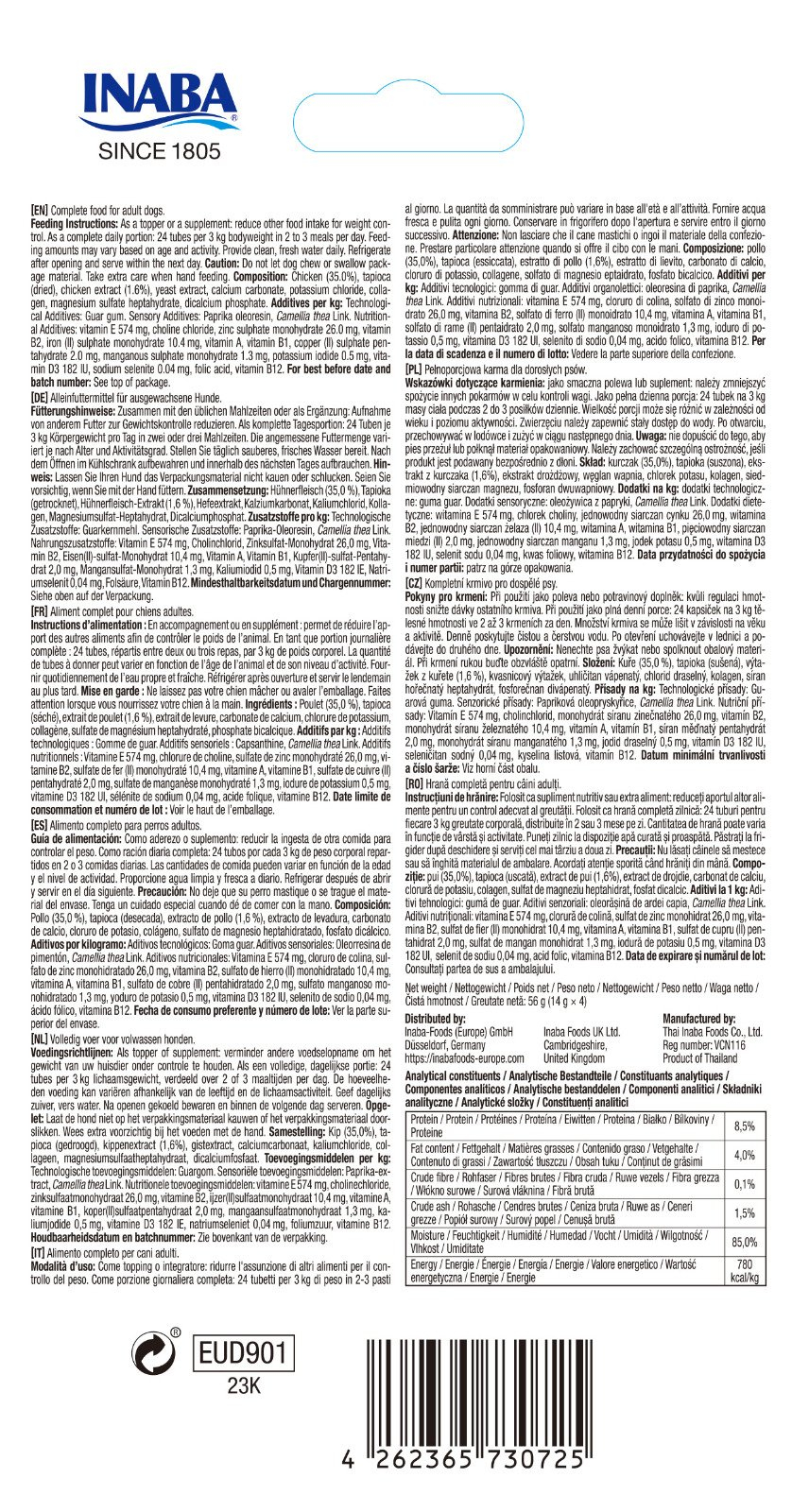Ingrediente: Apă, pui, amidon de tapioca, aromă naturală de pui, gumă guar, extract de drojdie, carbonat de calciu, clorură de potasiu, gelatină, oleoresină de boia (colorant), supliment de vitamina E, sulfat de magneziu, clorură de colină, minerale (fosfat de calciu, sulfat de zinc, sulfat feros, sulfat de cupru, sulfat de mangan, iodură de potasiu), extract de ceai verde, vitamine (riboflavină, acetat de vitamina A, mononitrat de tiamină, supliment de vitamina D3, acid folic, supliment de vitamina B12), selenit de sodiu.