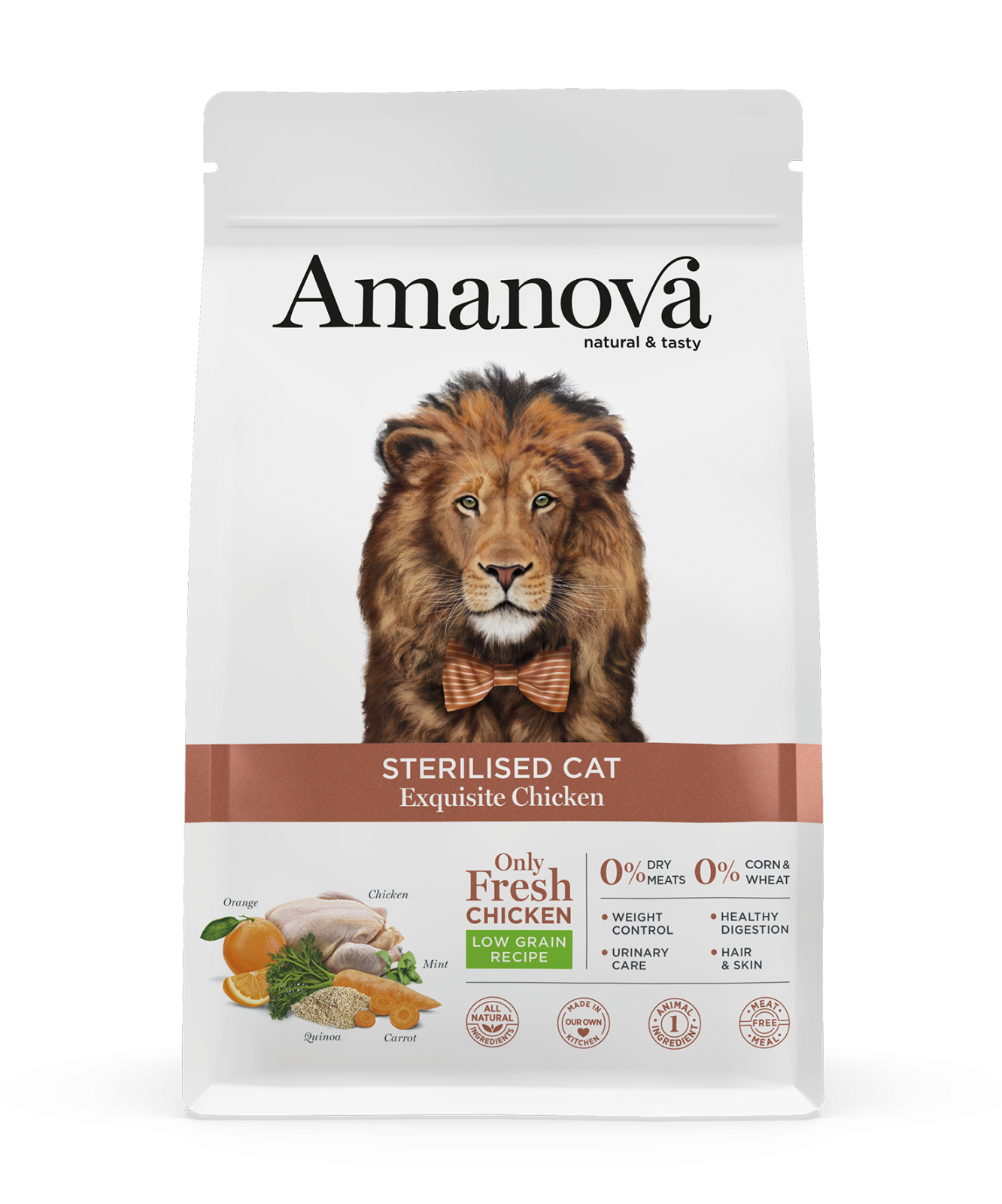 Hrană Uscată Pisică Adult, AMANOVA, Sterilizat, Hipoalergenic, Pui, 6kg este o hrană super-premium, fără cereale, special formulată pentru pisicile sterilizate de peste 12 luni. Preparată cu pui proaspăt ca unică sursă de proteină animală, această rețetă oferă o nutriție completă, ușor digerabilă și adaptată nevoilor specifice după sterilizare.