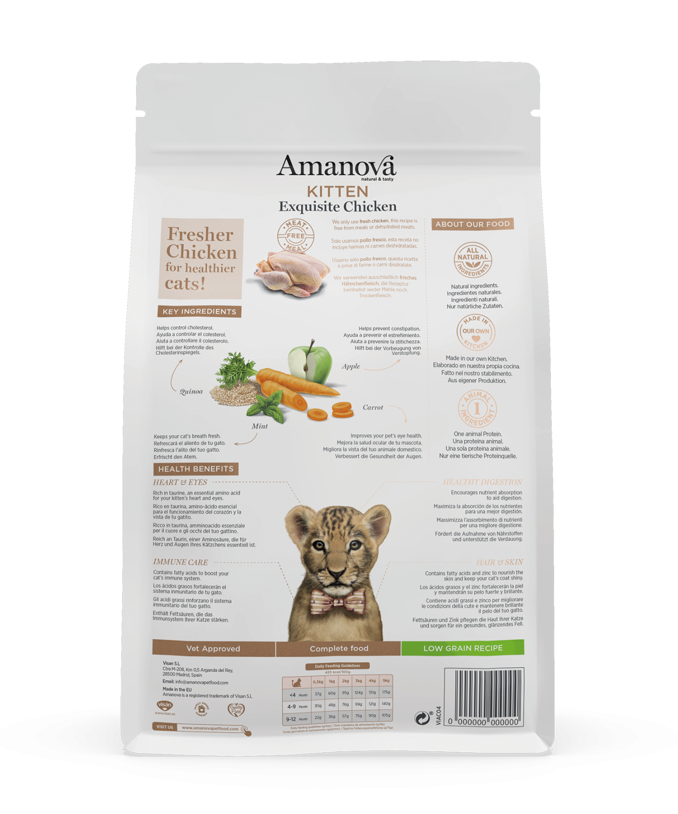 Hrană Uscată Pisică Junior, AMANOVA, Hipoalergenic, Pui, 4kg este o hrană super-premium, special formulată pentru pisoi de la vârsta de 2 luni, oferind un aport nutrițional complet pentru o creștere sănătoasă și echilibrată. Rețeta este preparată exclusiv cu pui proaspăt ca unică sursă de proteină animală, fiind ușor digerabilă și ideală pentru pisoii sensibili.