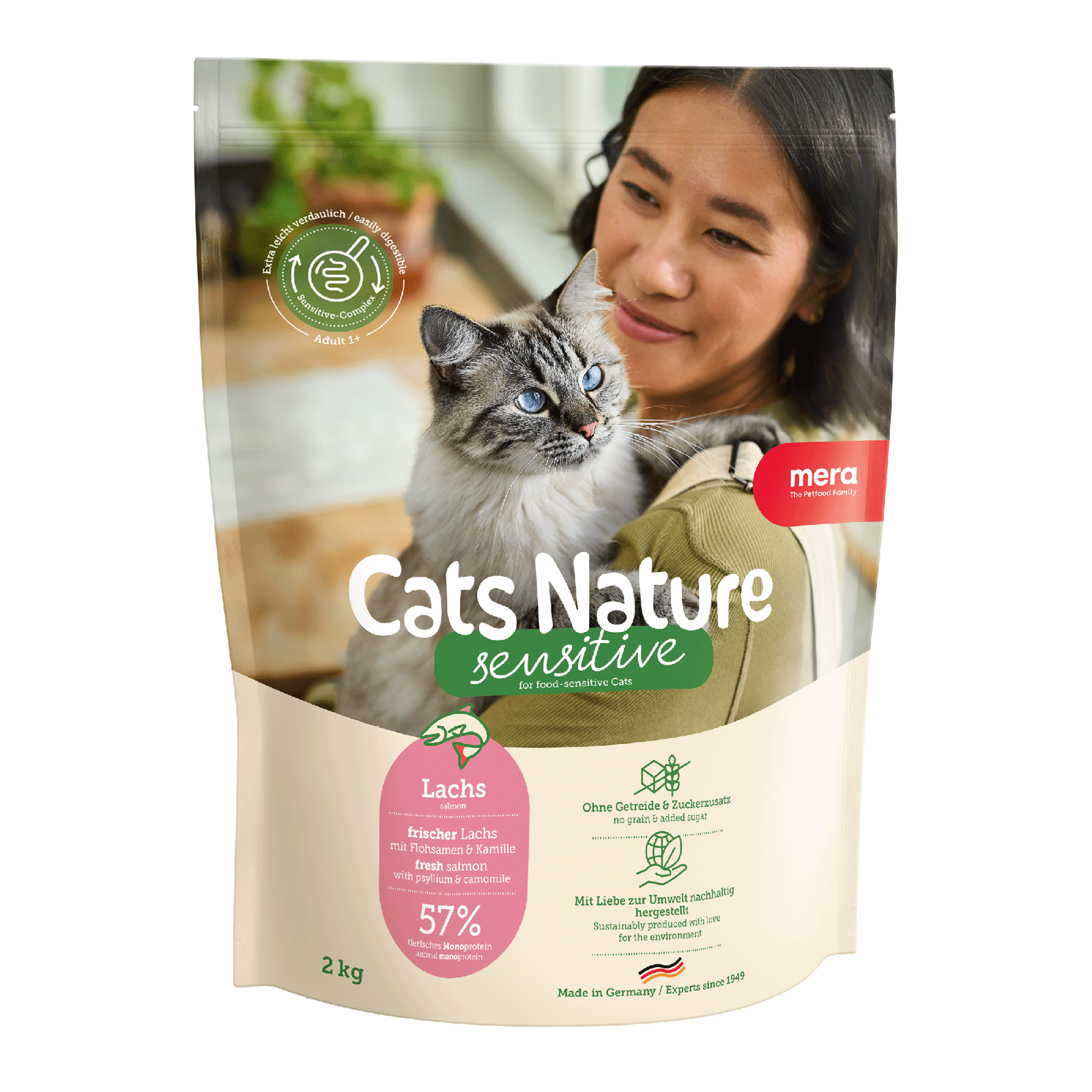 Hrană Uscată Pisică Adult, MERA Cats Nature Sensitive, Somon, 400g este o hrană super-premium completă, special formulată pentru pisicile adulte cu digestie sensibilă. Rețeta conține proteine de somon de înaltă calitate și ingrediente atent selecționate, ușor digerabile, care susțin toleranța digestivă și contribuie la starea generală de bine.