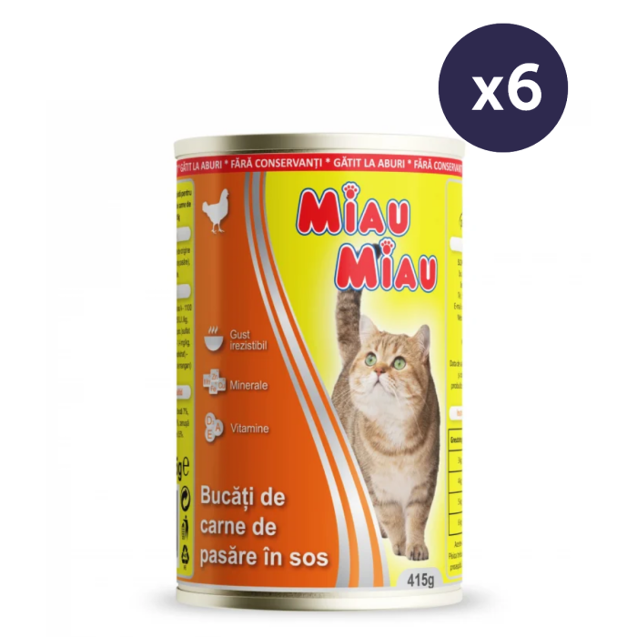 Pachet Economic MIAU MIAU Conservă, Hrană Umedă Pisică Adult, Pui, 6x415g este o hrană umedă premium completă, special formulată pentru pisicile adulte. Conținând bucăți delicioase de carne de pui (4%) într-un sos savuros, această hrană satisface nevoile nutriționale ale pisicilor și este potrivită chiar și pentru cele mai pretențioase feline.