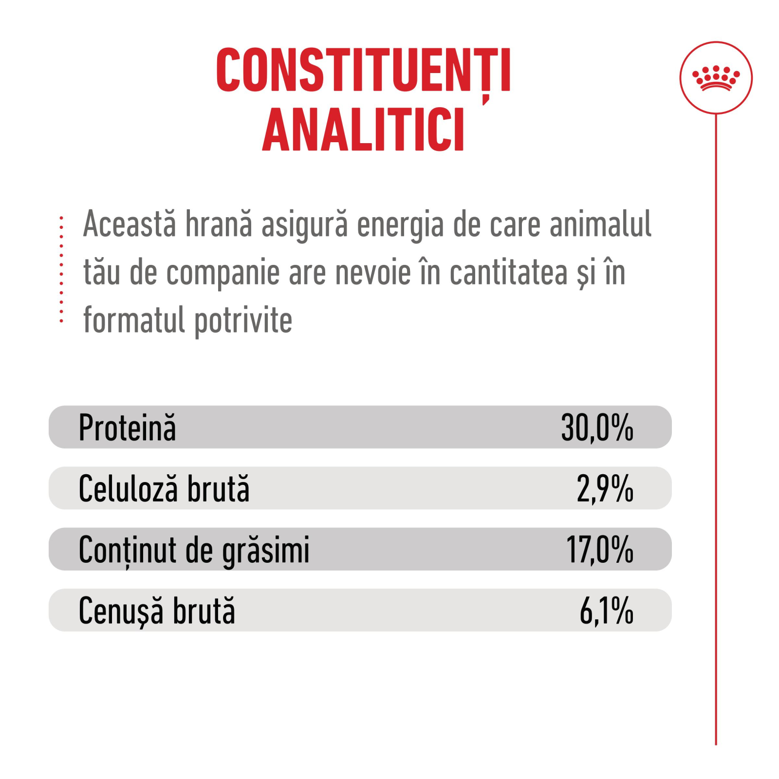Aditivi/kg: Vitamina A: 15.300 UI, Vitamina D3: 800 UI, Vitamina E: 460 mg, Vitamina C: 370 mg, Taurină: 2,3 g, Triptofan: 4,6 g, Fier: 34 mg, Iod: 3,5 mg, Cupru: 11 mg, Mangan: 45 mg, Zinc: 130 mg, Seleniu: 0,05 mg. Antioxidanți: incluși pentru prospețime. Compuși analitici: proteină 30,0%, grăsimi 12,5%, cenușă brută 5,8%, fibre brute 4,2%, acid linoleic 3,7%, fosfor 0,6%, EPA+DHA 0,6%, betacaroten 15 mg/kg, licopen 7 mg/kg. Energie metabolizabilă: 3.783 kcal/kg