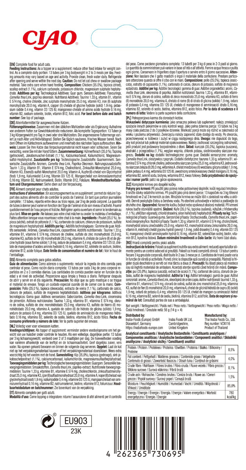Ingrediente: apă, pui, amidon de tapioca, arome naturale, aromă naturală de scoici, gumă guar, carbonat de calciu, taurină, supliment de vitamina E, clorhidrat de tiamină, clorură de colină, oleorezină de piper (culoare), extract de ceai verde, minerale (sulfat de zinc, sulfat de magneziu, sulfat feros, chelat de aminoacizi de cupru, iodură de potasiu, chelat de aminoacizi de mangan), vitamine (complex de menadionă de sodiu bisulfit, acetat de vitamina A, supliment de vitamina D3, riboflavină, supliment de vitamina B12, acid folic), selenit de sodiu