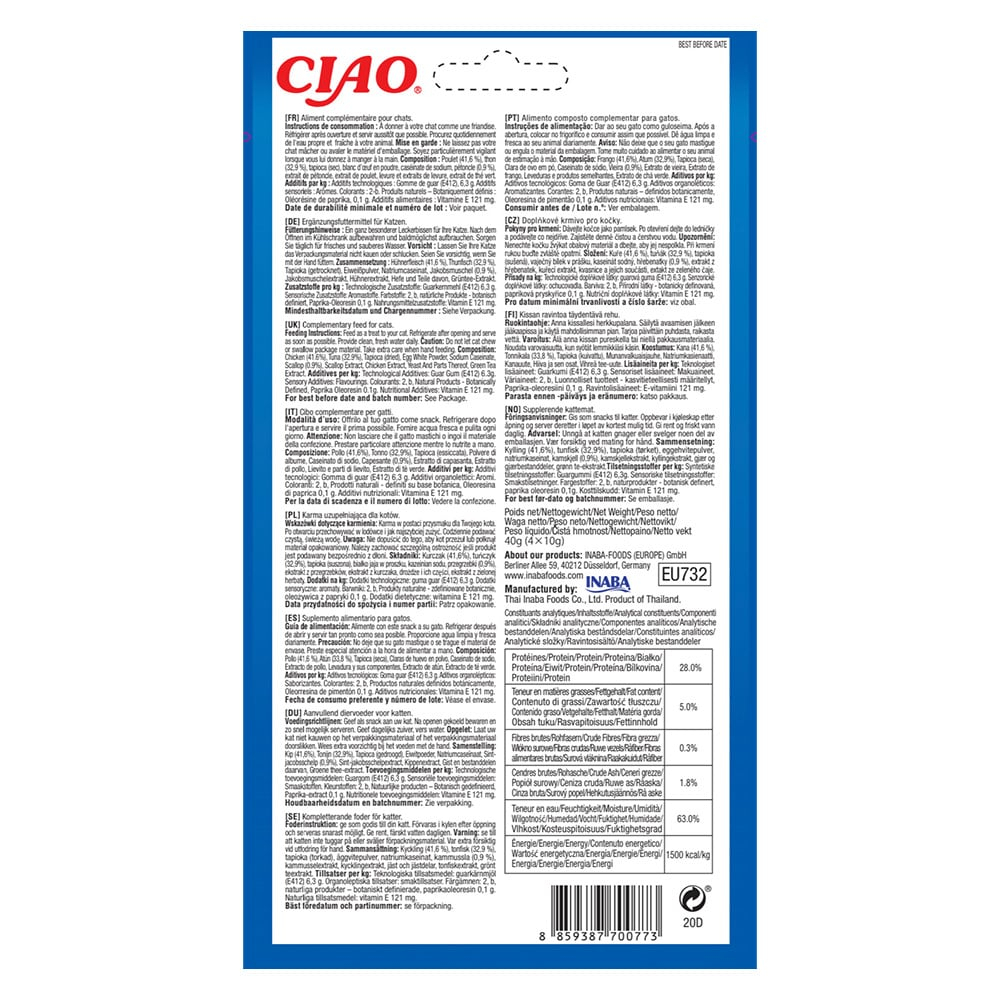 Ingrediente: Pui, ton, apă, tapioca, albuș de ou, cazeinat de sodiu, gumă guar, aromă naturală de pui, arome naturale, extract de drojdie, aromă naturală de ton, supliment cu vitamina E, oleorezină de ardei (colorant), extract de ceai verde