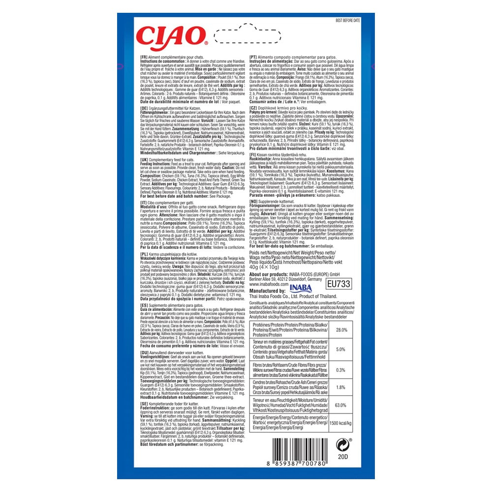 Ingrediente: Pui, apă, tapioca, albuș de ou, cazeinat de sodiu, gumă guar, aromă naturală de pui, arome naturale, extract de drojdie, aromă naturală de ton, supliment cu vitamina E, oleorezină de ardei (colorant), extract de ceai verde
