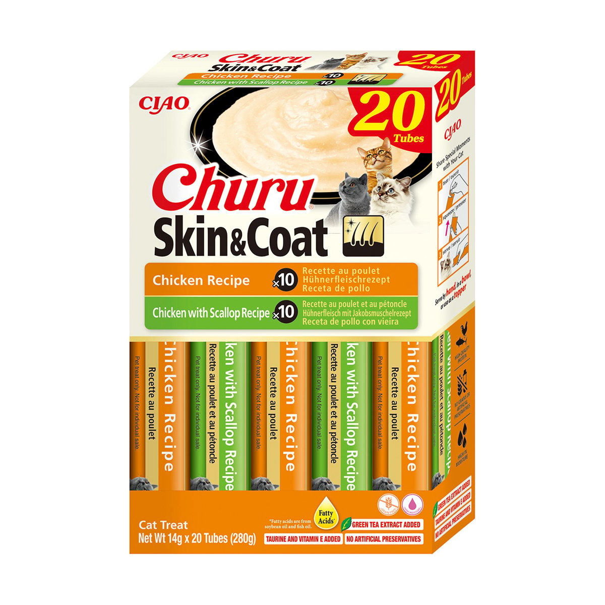 Fiecare pachet conține 10 tuburi cu gust de Pui și 10 tuburi cu gust de Pui și Scoici, ambele realizate din ingrediente de înaltă calitate, precum pui crescut la fermă și scoici sau ton natural pescuit din sălbăticie. Uleiul de pește, sursă naturală de acizi grași Omega-3, ajută la menținerea unei pieli sănătoase și a unei blăni lucioase. În plus, umiditatea ridicată contribuie la hidratarea optimă a pisicii.