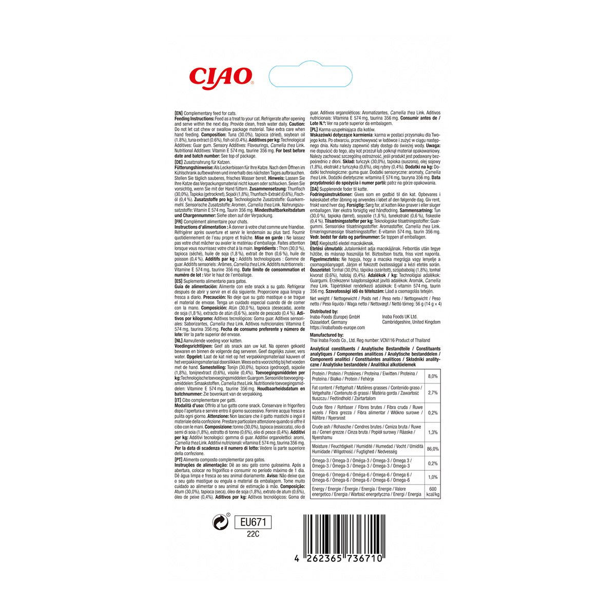 Ingrediente: Ton (30,0%), tapioca (uscata), ulei de soia (1,8%), extract de ton (0,6%), ulei de pește (0,4%)