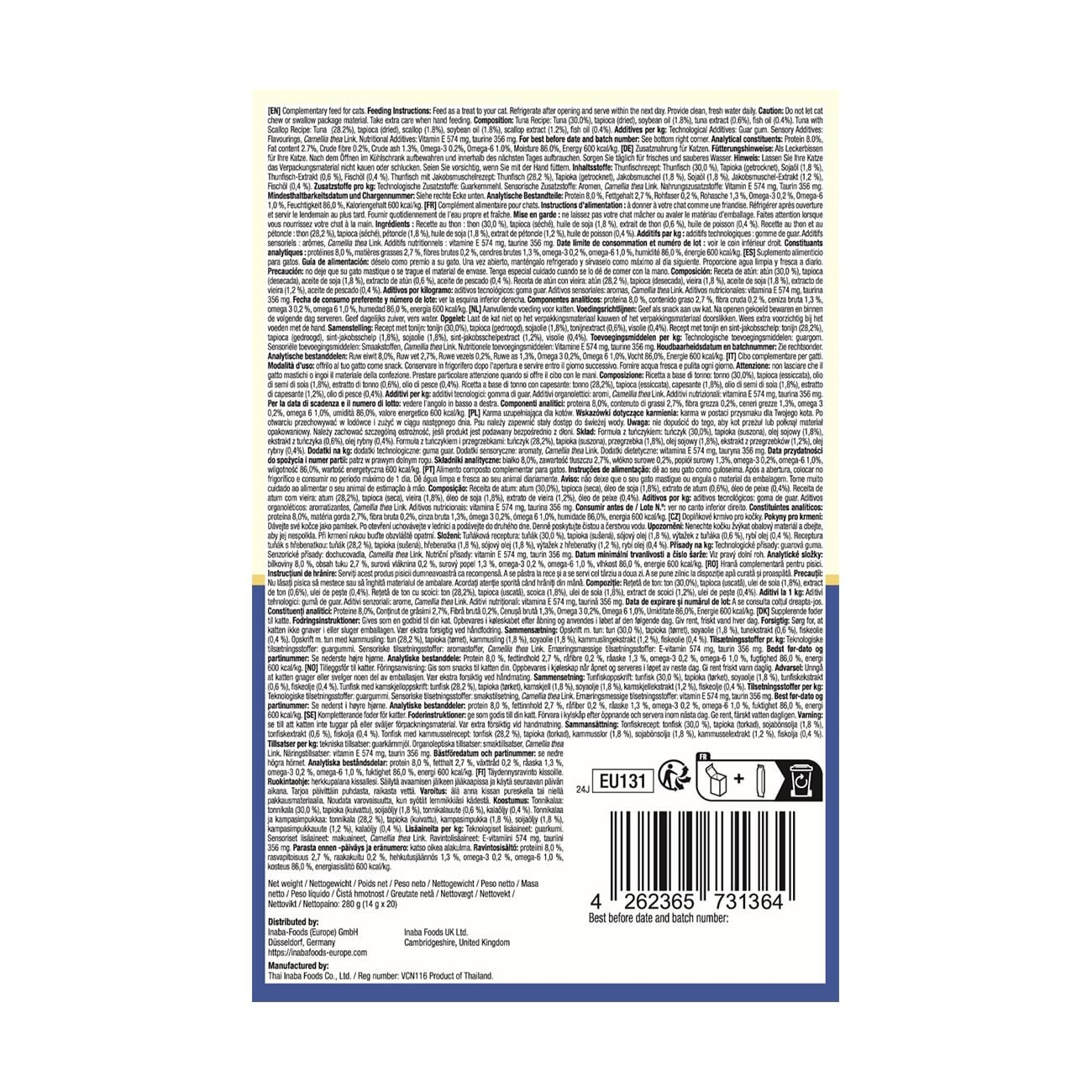 Ingrediente: Apă, ton, amidon de tapioca, ulei de soia, arome naturale, gumă guar, aromă naturală de ton, ulei de pește, supliment de vitamina E, taurină, extract de ceai verde.
