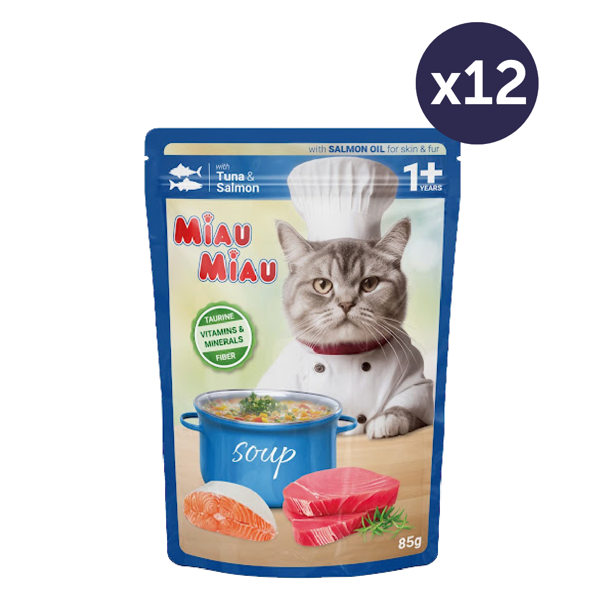 Pachet Economic Hrană Umedă Pisică Adult, MIAU MIAU, Ton și Somon în Supă, 12x85g este o hrană complementară delicioasă, creată pentru a satisface gusturile rafinate ale pisicilor adulte. Rețeta combină ton și somon – două surse de proteine de înaltă calitate – într-o supă gustoasă, care contribuie la hidratarea optimă a pisicii.