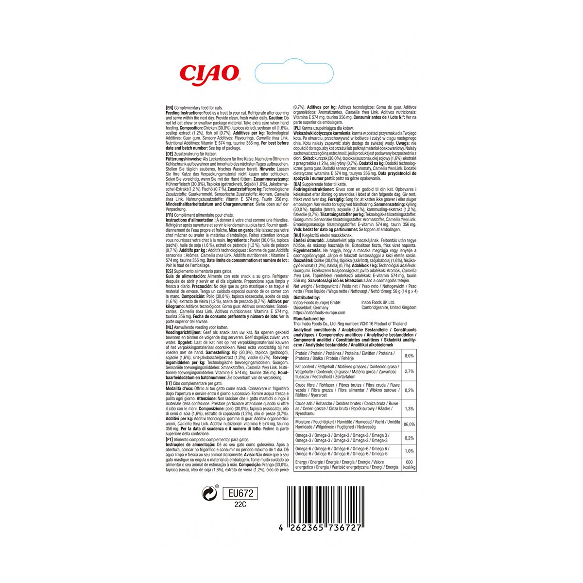 Ingrediente: Pui (30%), tapioca (uscată), ulei de soia (1,6%), extract de scoici (1,2%), ulei de pește (0,7%), gumă de guar, extract de ceai verde, vitamina E 574 mg/kg, taurină 356 mg/kg