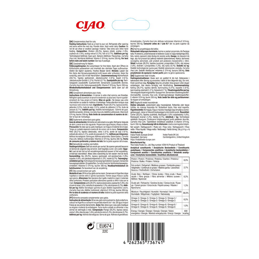 Ingrediente: Pui (28,2%), tapioca (uscată), scoici (1,8%), ulei de soia (1,6%), extract de scoici (1,2%), ulei de pește (0,7%), vitamina E 574 mg/kg, taurină 356 mg/kg