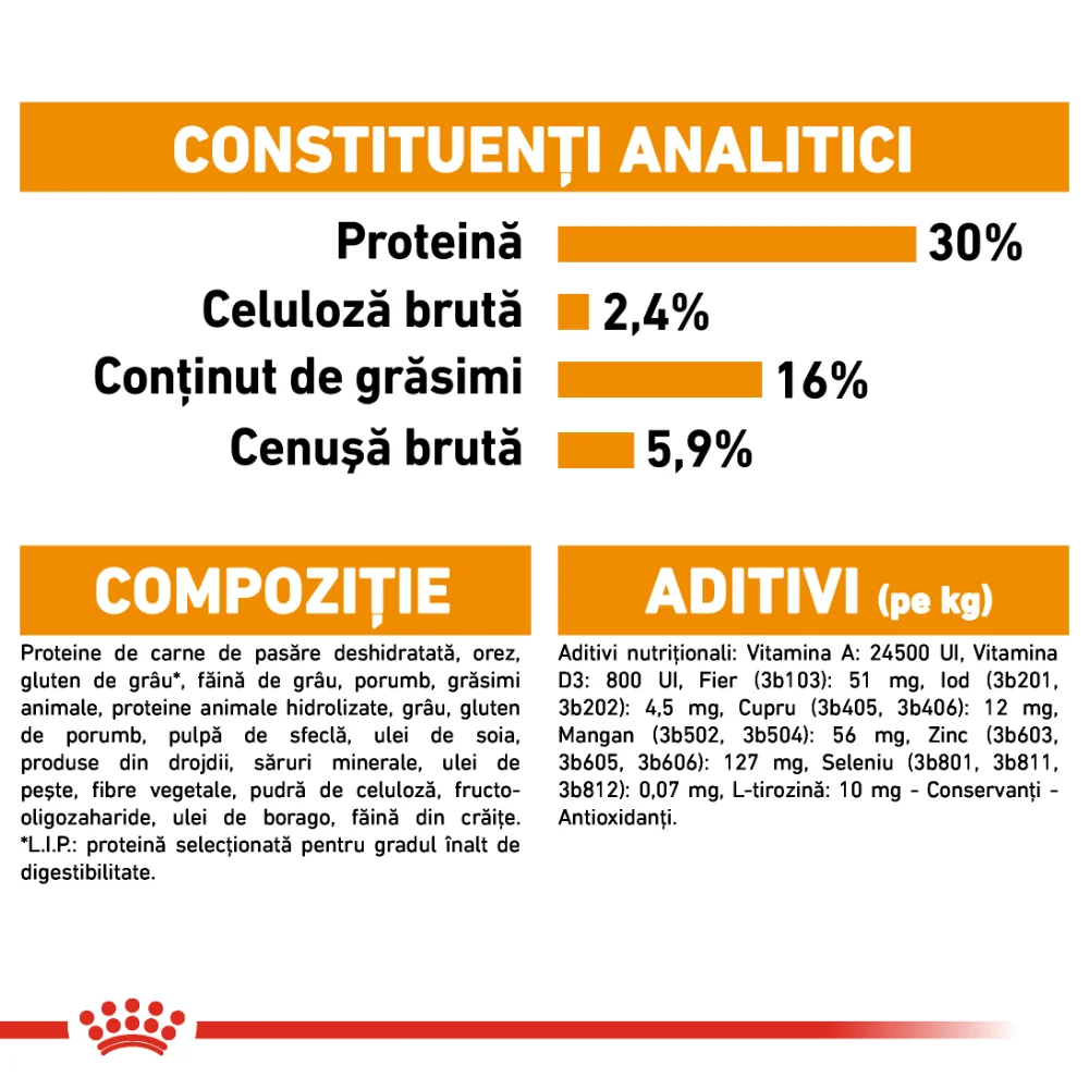 CONSTITUENŢI ANALITICI: Proteină: 30,0% - Celuloză brută: 2,4% - Conţinut de grăsimi: 16,0% - Cenuşă brută: 5,9% - Acizi graşi omega-3: 8,9 g/kg - Acizi graşi omega-6: 38,8 g/kg.
