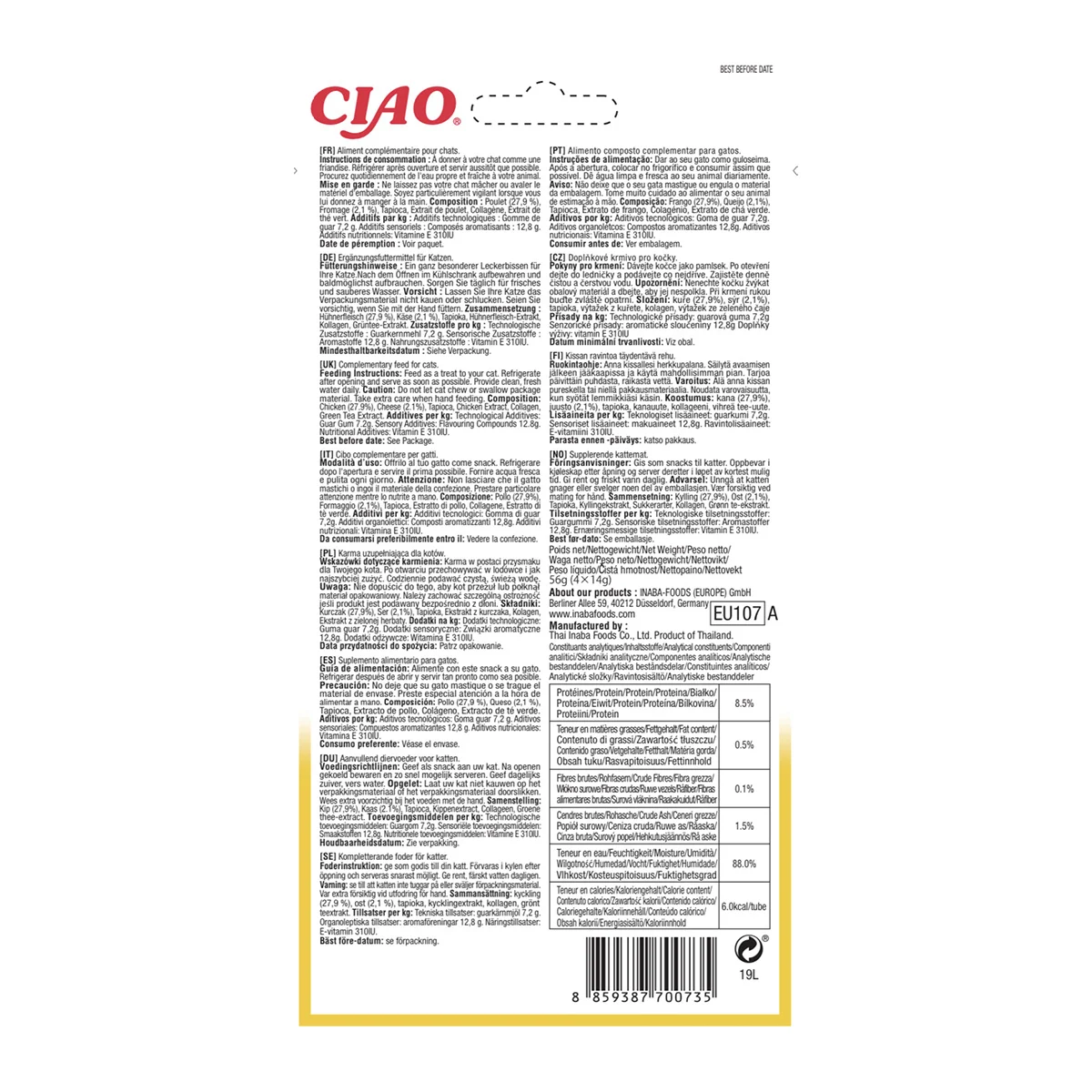 Recompense Cremoase Pisică Adult, CHURU, Pui și Brânză, 4x14g sunt gustări complementare hyper-premium, special formulate pentru a oferi pisicilor adulte o experiență savuroasă și nutritivă. Combinația dintre pui și brânză aduce un gust intens și o textură cremoasă, adorată chiar și de cele mai mofturoase feline.